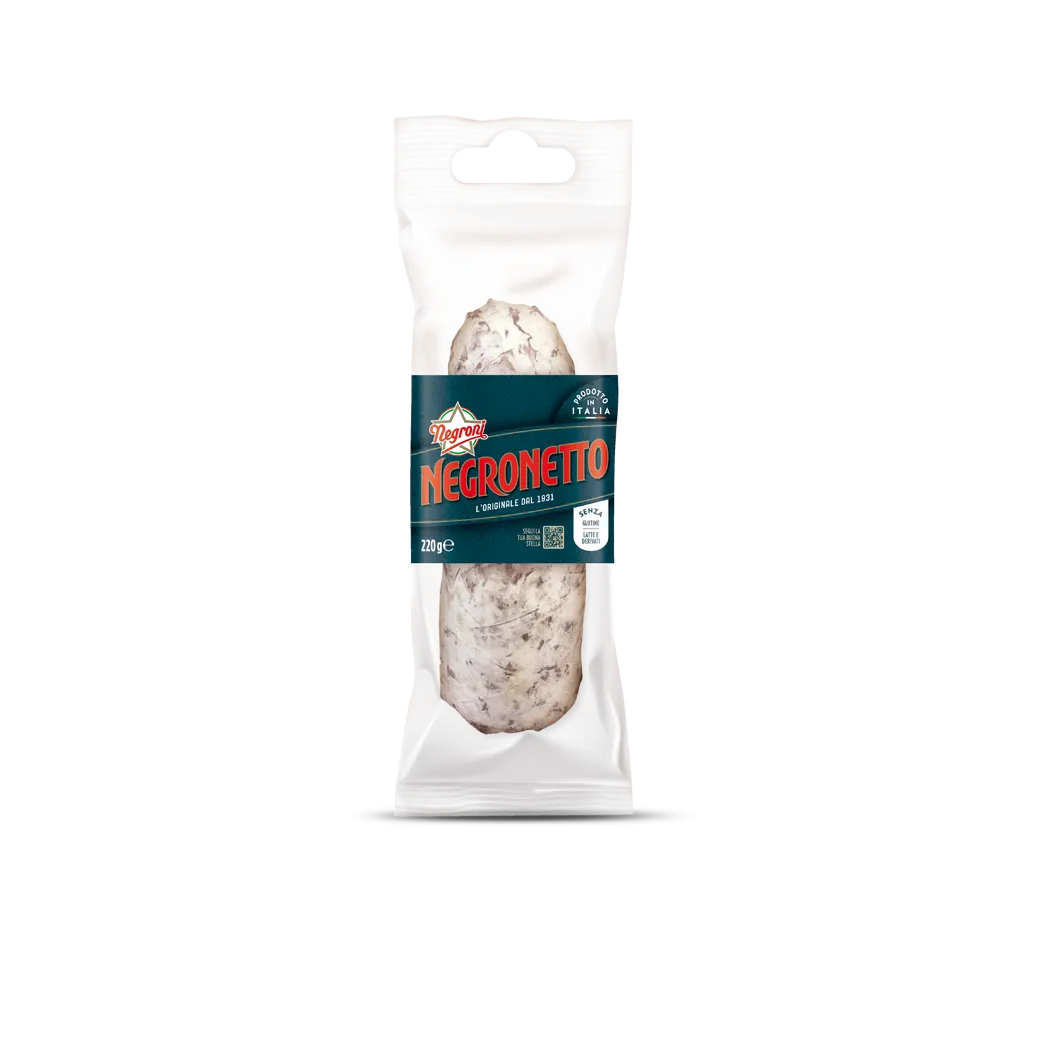 Negronetto, das wahre Symbol für Negroni und die berühmteste aller Salamis, wird aus sorgfältig ausgewähltem, mittelgrob gehacktem, rein italienischem Schweinefleisch hergestellt. Sie zeichnet sich durch ihren einzigartigen feinen Geschmack und Duft aus. In Schutzatmosphäre verpackt, um die Frische zu bewahren.