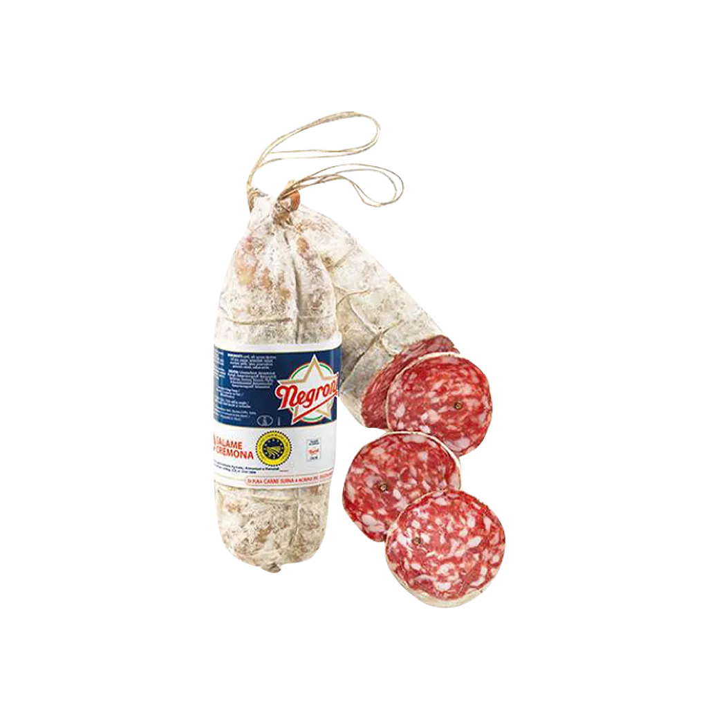 Diese nach dem traditionellen Rezept aus Cremona zubereitete und durch g.g.A. zertifizierte Salami verdankt ihren feinen Geschmack nicht nur dem feuchten Klima ihres Herkunftsgebiets, sondern auch der sorgfältigen Fleischauswahl. Mittelfein gehacktes Fleisch wird meisterhaft gewürzt und in Naturdarm gefüllt.