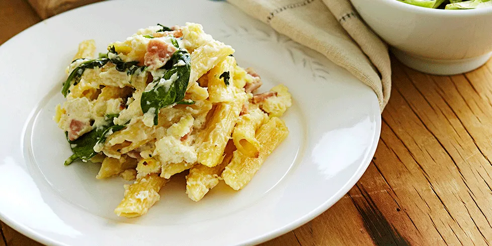 Es genügen ein wenig Ricotta und einige Scheiben Speck und schon ist die Sauce fertig. Um dieser Pastasauce, die für den großen Hunger geeignet ist, ein wenig mehr Geschmack zu verleihen, können Sie in Ihrem Gefrierschrank nachsehen, ob tiefgefrorener Mangold vorhanden ist.