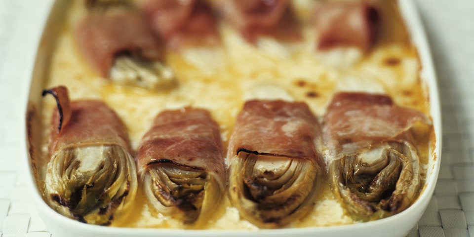 Zuerst wird die Endivieköpfe ungefähr 10 Minuten in Salzwasser gekocht; gießen Sie ab und der Länge nach halbieren Sie. Nun wickeln Sie um jede Endiviehälfte eine Scheibe Schinken und legen Sie sie dann in eine Backform. Nun kann die Béchamelsoße zubereitet werden. Dafür wärmen Sie die Milch auf, während Sie in einer anderen Kasserolle die Butter schmelzen, zu der sie das gesiebte Mehl geben.