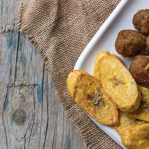 Mortadella – Klösse mit Zitronen und Platanen-Chips