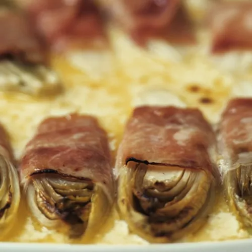 Kürbisblüten mit Scamorza-Käse und gekochtem Schinken gefüllt