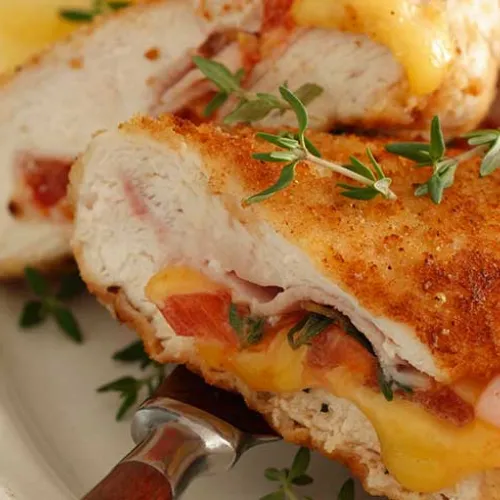 Kürbisblüten mit Scamorza-Käse und gekochtem Schinken gefüllt