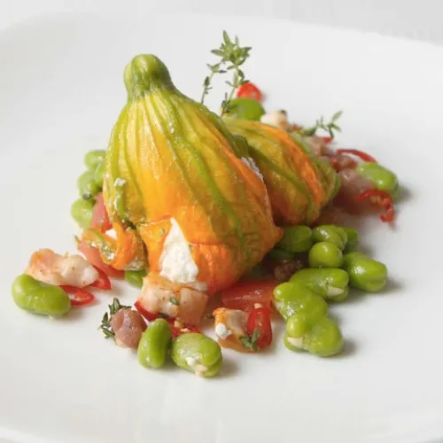Mit ricotta gefüllte Zucchiniblüten mit ackerbohnen