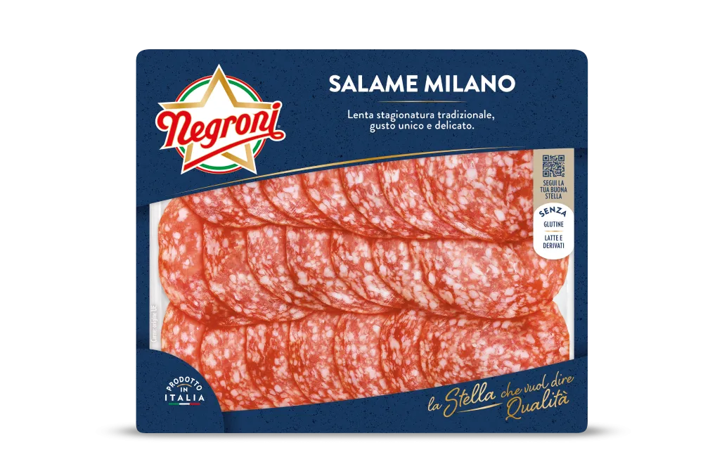 Hergestellt nach klassischer Mailänder Rezeptur mit feiner Körnung. Besonders mild im Geschmack, abgerundet mit weißem Pfeffer und Knoblauch. Große und kompakte Scheiben.