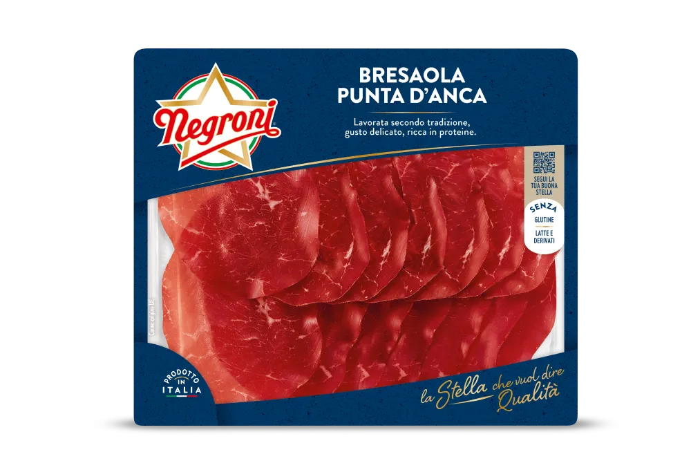 Dry-cured beef, it is produced from chosen cuts of beef legs, expertly processed with a blend of salt and spices. Finely cut slices are bright red and release a delicate and lightly aromatic fragrance. Very lean, bresaola makes a refined, light dish when dressed with extra-virgin olive oil and lemon.