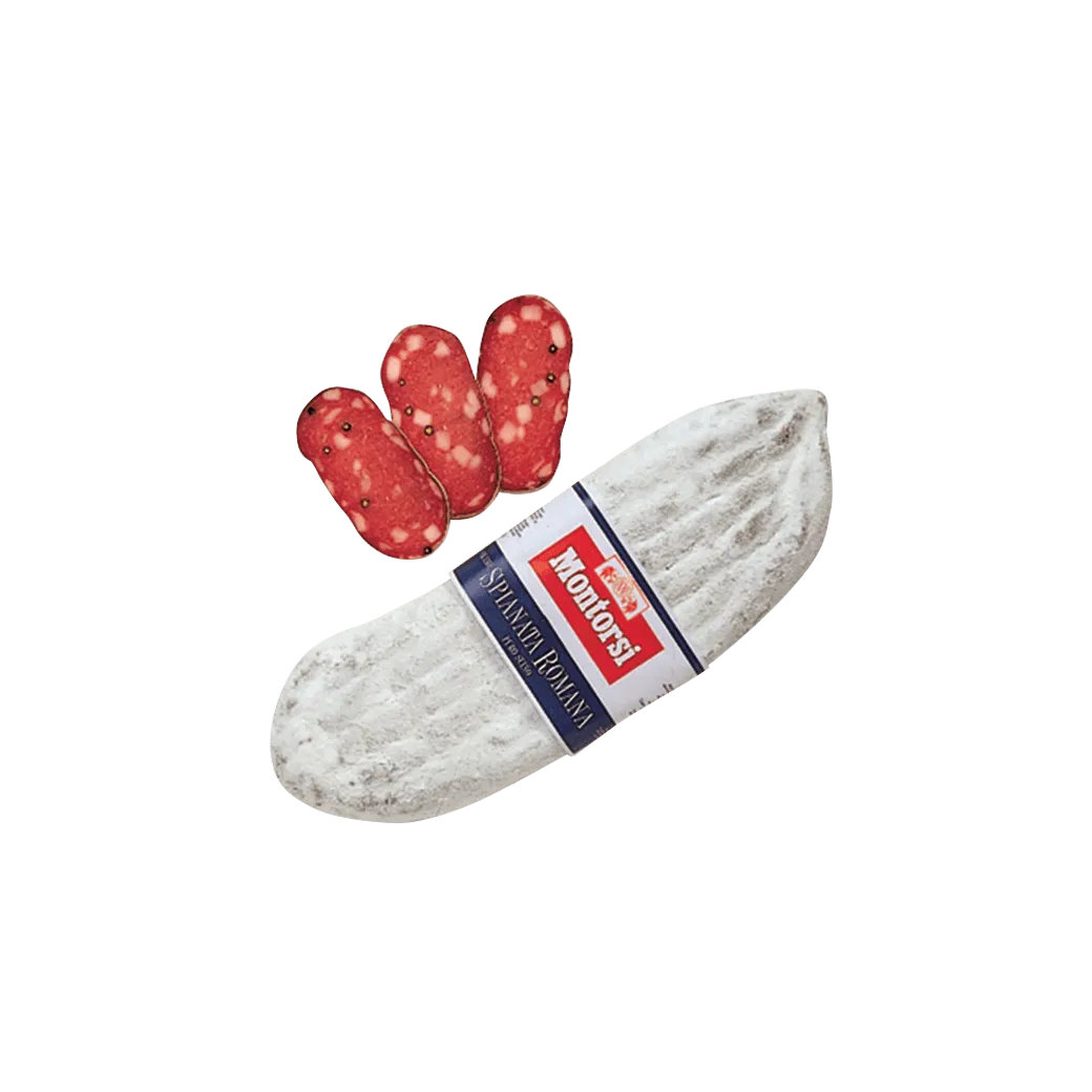 This typical salami of the Latium region is produced with high quality lean pork meat. It is dry-cured in special little metal cages that produce the typical pressed shape. Slices are full-bodied and elongated. Pepper and other flavourings ensure a mild spicy taste.