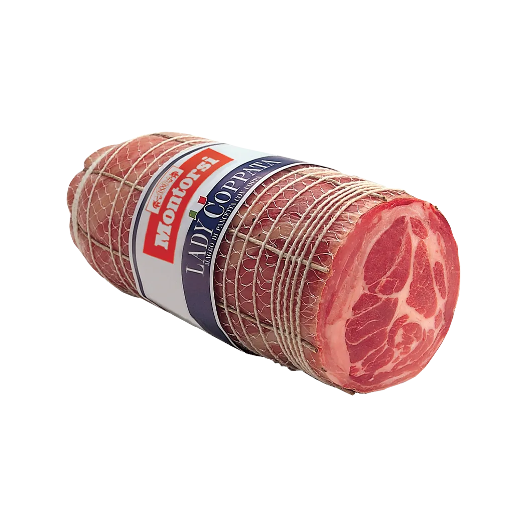 This specialty is produced by processing low fat, dry-salted pork belly. It is skinned and wrapped around a coppa, then tied and dry-cured. Finely cut slices are compact, lean and with a slightly spiced flavour.
