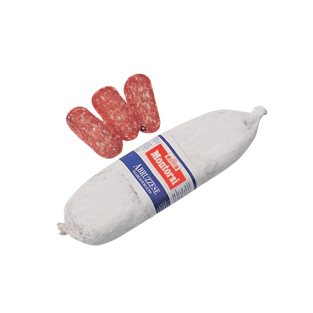 Typical of Abruzzo (Central-Southern Italy region) recipe, it is made with very finely ground meats, masterly seasoned and dry-cured in a little metal cage to give its typical flat shape. It has a delicate flavour with a hint of pepper.
