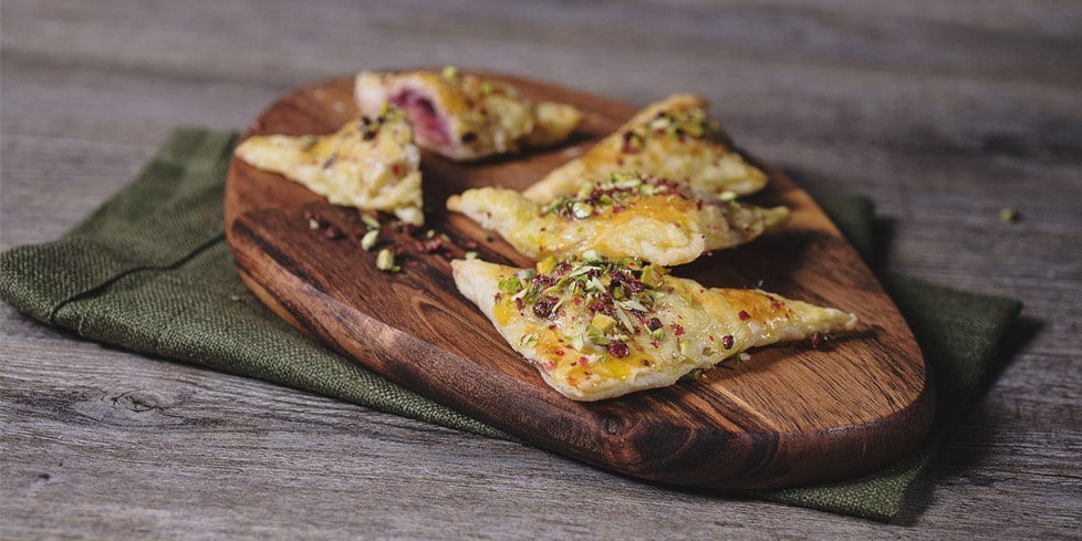 - Brush the triangles with beaten egg and sprinkle them with pistachio and pink pepper.