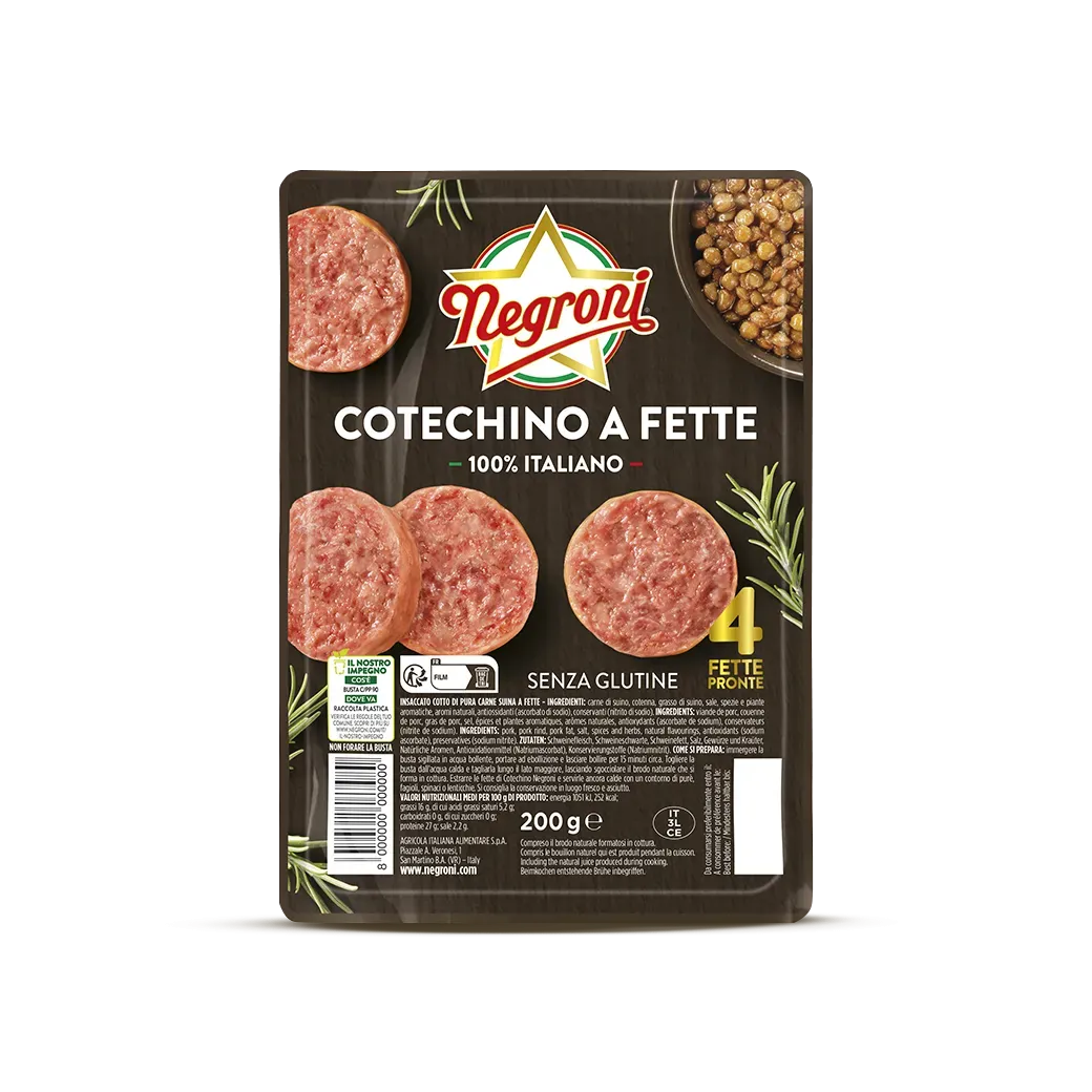 Cotechino (pork sausage stuffed in casing) is prepared by mincing the pork meat in a mincer. Trimming can be performed before this process, when required. The mixture thus obtained is stuffed into a casing and then packed in aluminum bags. The product is then precooked under vacuum or at atmospheric pressure. Sliced Cotechino 100% Italian Meat comes in a 4 slices convenience pack.