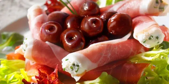 Confectionner, pour ce mélange, des cornets avec les  tranches de Jambon. Disposer les cornets ainsi garnis sur un lit de laitue, dans des assiettes individuelles. Garnir au centre de chaque assiette avec les cerises au marasquin. Décorer avec des olives noires. Assaisonner avec l’huile d’olive et le vinaigre de pommes. Il s’agit d’un plat facile que vous pouvez personnaliser en fonction des herbes aromatiques de saison.