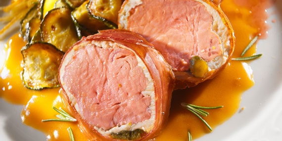 Etaler ce mélange sur les escalopes de porc et appliquer par dessus les tranches de Jambon Cru. Faire chauffer l’huile dans une poêle. Ajouter le hachage grossier d’oignon, de carotte et de céleri. Laisser égoutter le hachage et ajouter les filets.