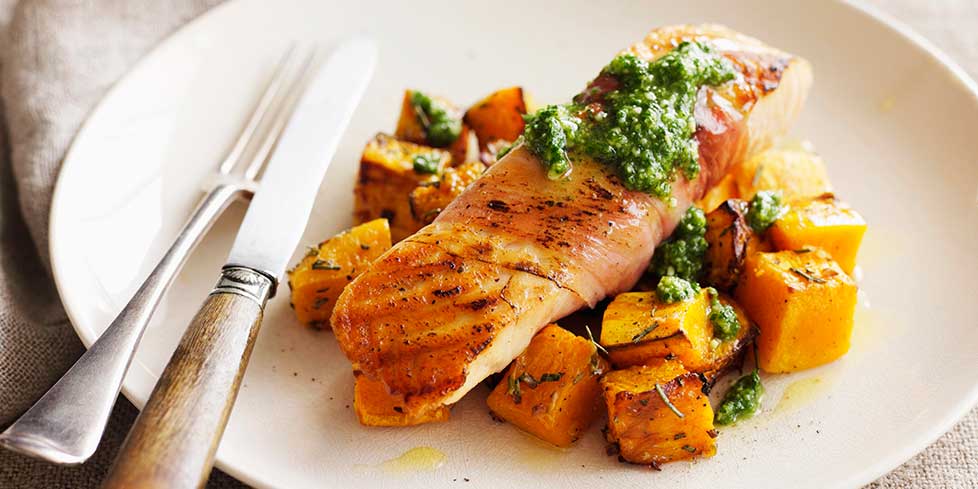 Associez le saumon et la pancetta à des patates douces sautées à la poêle ou à de gros dés de courge. Pour un plat un peu plus léger, vous pouvez utiliser la courgette qui se marie très bien aussi bien avec le saumon qu’avec la pancetta. Avec cette recette de saumon à la pancetta, vous pouvez également réaliser des verrines à servir en brunch pour épater vos convives. Pour contraster avec le goût prononcé du saumon et de la pancetta, nous vous conseillons d’agrémenter le plat d’un pesto de persil. Cettesauce verte faite maison apportera à votre plat un esprit gastronomique.