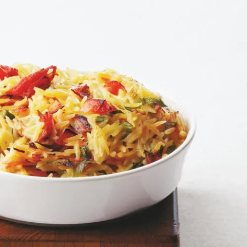 Risotto aux poireaux, au lard maigre croquant et au jambon cuit