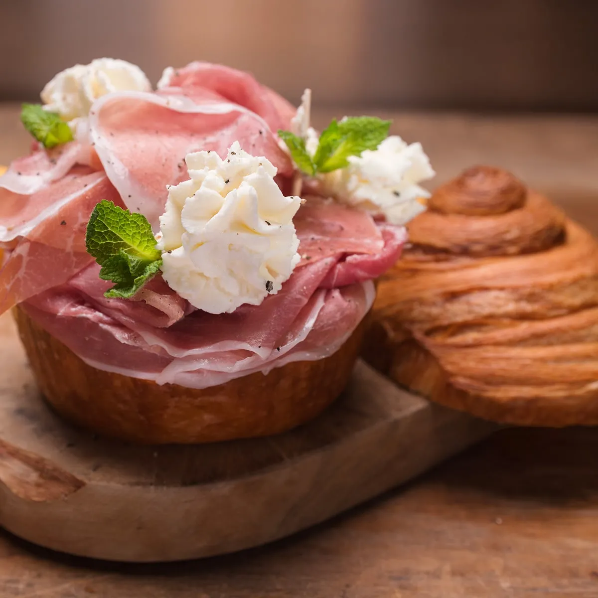 Pane sfogliato al burro con prosciutto crudo, formaggio e menta