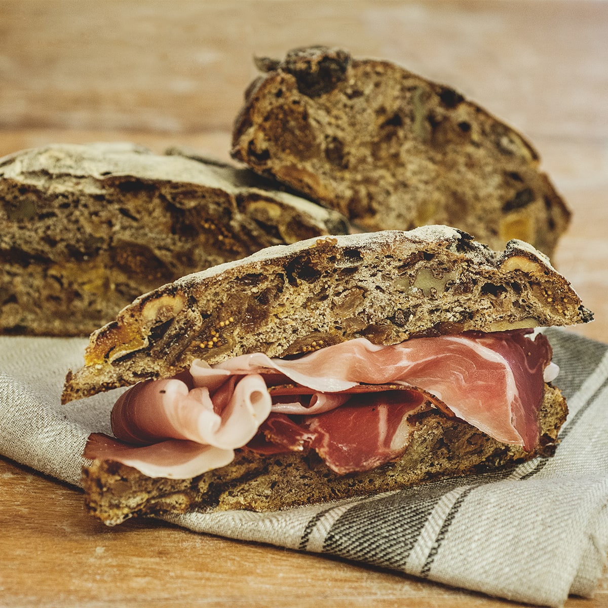 Ricco di ingredienti e di sapore, il Panfrutto si presta ad accogliere salumi dal sapore deciso. Il ritorno affumicato dello Speck delle Alpi Negroni, esalta tutti gli ingredienti dolci di questo pane, conferisce la giusta sapidità e crea un equilibrio unico ed irresistibile.