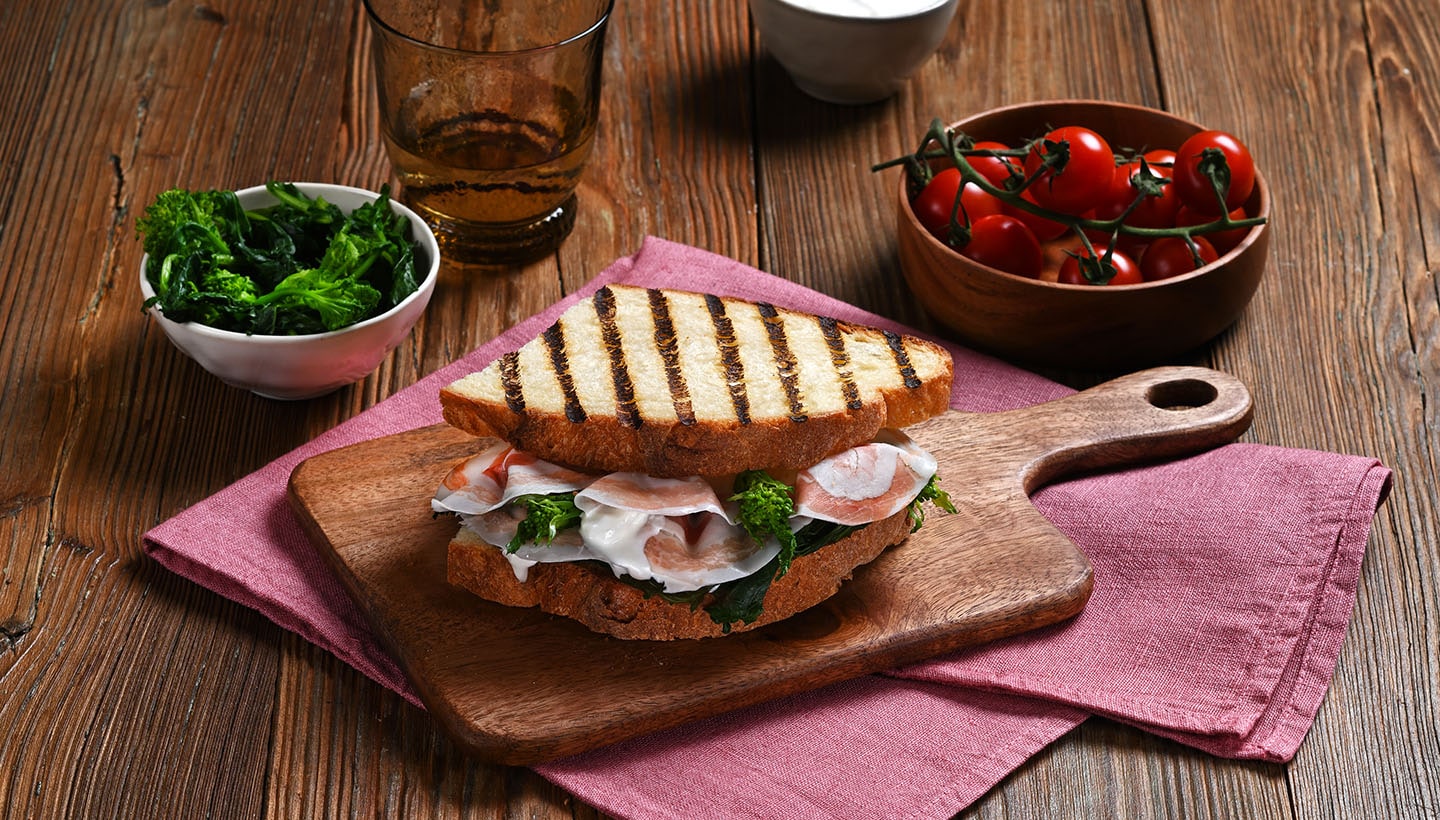 Pulite le cime di rapa e scottatele in acqua bollente per 5 minuti. Scolatele e saltatele in padella con olio extravergine di oliva, sale, pepe, l’aglio e il peperoncino. Dopo qualche minuto spegnete il fuoco e trasferite le cime di rapa in un piatto. Nella stessa padella tostate le fette di pane di Altamura. Farcite una fetta di pane con le cime di rapa, la Pancetta di Zibello 100% italiana Negroni e la stracciatella. Coprite con l’altra fetta di pane tostata e servite.