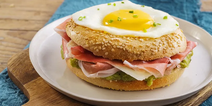Bagel con uovo, prosciutto crudo e crema di avocado
