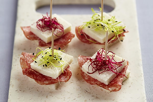 Per preparare questo bellissimo club sandwich avete bisogno del pane per tramezzini bianco che in genere si trova in commercio in fette rettangolari lunghe e senza crosta. Per ogni tipo di farcitura vi serviranno 1 affettato una salsa, delle foglie di verdure, del formaggio e dei germogli di porro oppure delle carote, barbabietole o cetriolo tagliati a julienne. Per comodità potete usare il Gran Antipasto Negroni che in una sola confezione vi permette di avere salame milano, coppa e prosciutto crudo. Per le salse, al di là dei nostri suggerimenti, potete usare i grandi classici: la maionese, oppure la salsa rosa. Con la coppa potete usare anche la salsa verde e ancora provate il patè di carciofi e la salsa tonnata che con il salame milano sta benissimo!