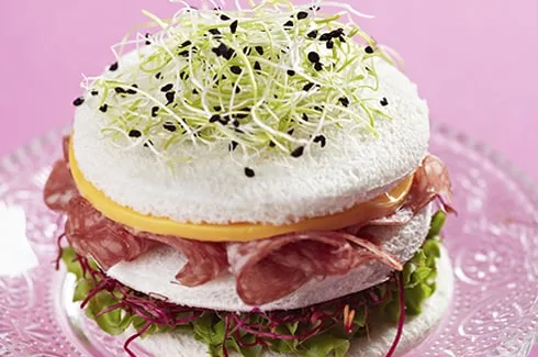 Riducete la mozzarella di bufala in straccetti e poggiatela sul primo disco di pane, sopra metteteci il prosciutto cotto e chiudete con un cerchio di pane. Per il secondo strato partite sempre dalla mozzarella, proseguite con il prosciutto e infine la rucola leggermente condita con olio e sale. Decorate l'ultimo cerchio di pane con i germogli e sistemate nel piatto di portata.