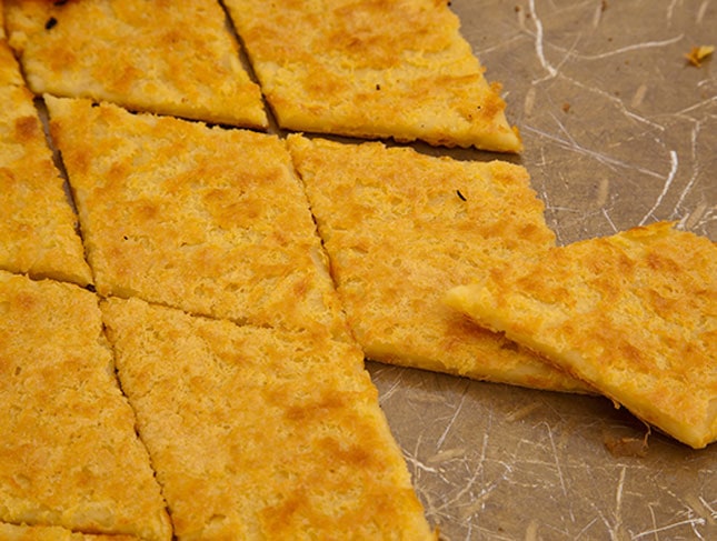 Lasciate intiepidire e tagliare la farinata a rombi e servirla come accompagnamento di prosciutto crudo o salame ma anche semplicemente da sola.