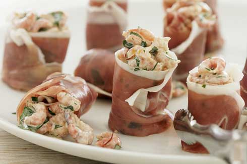 Per i fan delle proteine questa è la ricetta perfetta. Il tempo di preparazione è minimo e riguarda solo i gamberetti. In caso fossero congelati potete cuocerli in acqua bollente solo per un paio di minuti, se invece li avete comprati freschi privateli del budellino e lasciateli a bagno nel succo di limone per tre o quattro minuti. Una volta cotti dal limone scolate i gamberetti, sistemateli in una ciotolina e conditeli con un filo di olio, pepe e prezzemolo. Potreste anche aggiungere un cucchiaino di maionese oppure amalgamare del formaggio spalmabile. Tagliate le fette di Prosciutto di Parma D.O.P. a metà per la lunghezza e arrotolatele intorno a tre o quattro gamberetti. Create dei cilindri da disporre sul piatto di portata in verticale e da condire ancora con un filino di olio extra vergine di oliva.
