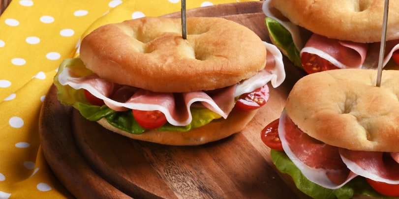 Focaccine con pomodorini, insalata e prosciutto crudo