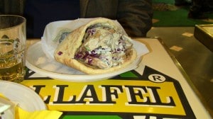 Le polpettine fritte, fatte di fave tritate, cipolla, aglio e coriandolo farciscono abbondantemente una pita , sgomitando accanto a cavolo rosso, cavolo bianco, cetriolo, melanzane anch’esse fritte, pomodoro fresco, salsa hummus .