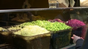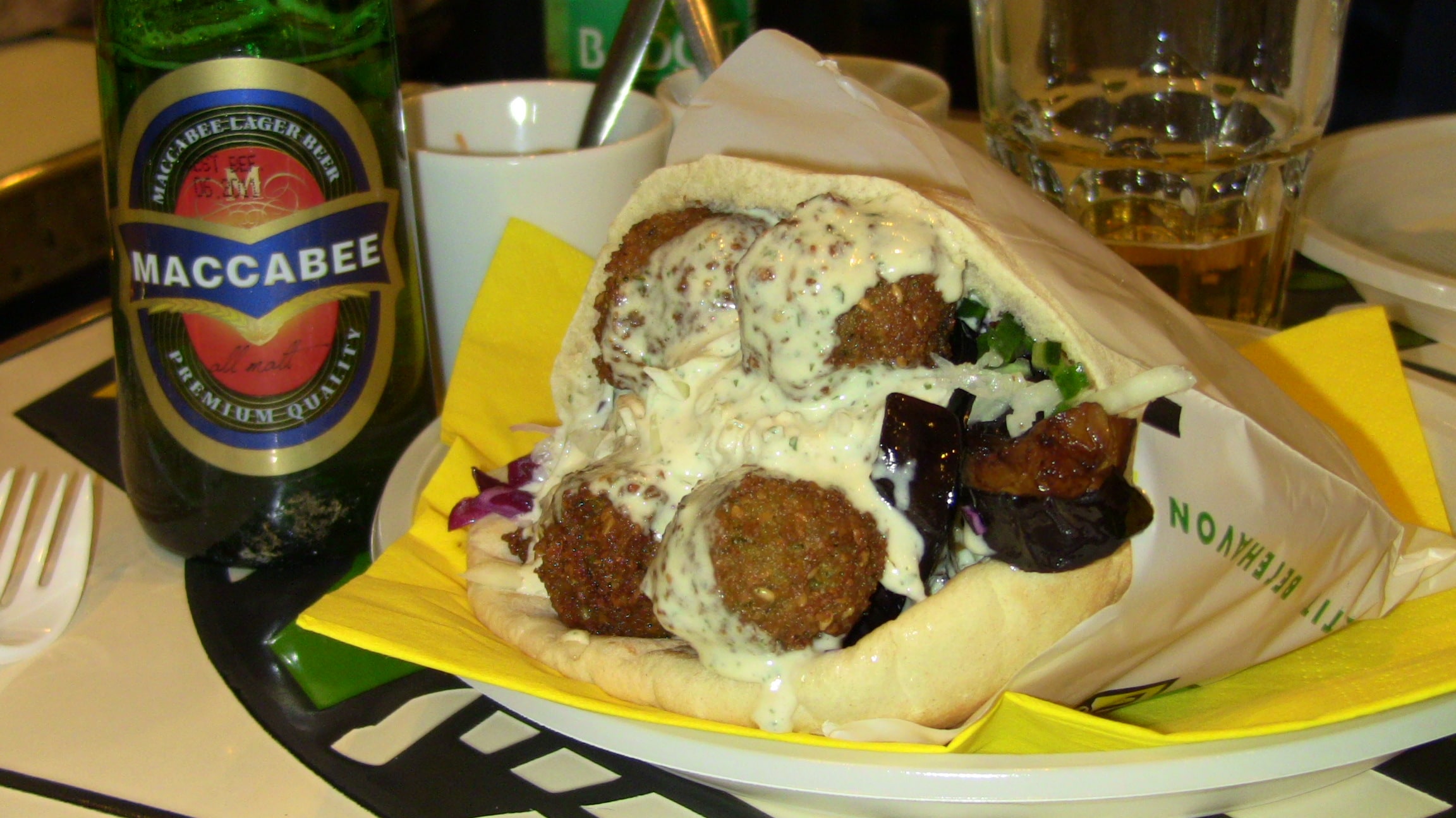 Lo “Special” (la versione vegetariana) batte tutti i panini, ma se proprio non riuscite a rinunciare alla carne, il menù propone pita “Merguez” (manzo speziato) e “Schawarma” (tacchino e agnello). In inverno servono zuppa calda di legumi profumata di spezie, portata in tavola in una colorata scodella di ceramica, smaltata di verde, giallo, nero e rosso. Mentre tutto attorno voci e movimento cicalecciano la quotidianità, in un via vai continuo. Soprattutto di giovani con la kippah , studenti ed impiegati che alla fine – perché tutto il mondo è paese – pagano lasciando il buono pasto aziendale a corredo del conto.