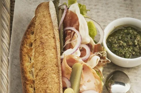 Tagliate a metà il panino e spalmate il lato piatto di salsa verde e sistemateci sopra le due foglie di lattuga, quindi il prosciutto crudo e poi la mortadella. Distribuite le fettine di cipolla, nella quantità che più vi piace, e i cetrioli sott’aceto che potete sciacquare sotto l’acqua corrente per togliere un po’ di aceto. Chiudete con il pane sul quale avrete spalmato la maionese. Se riuscite a chiuderlo il panino è pronto per essere morso con gusto.