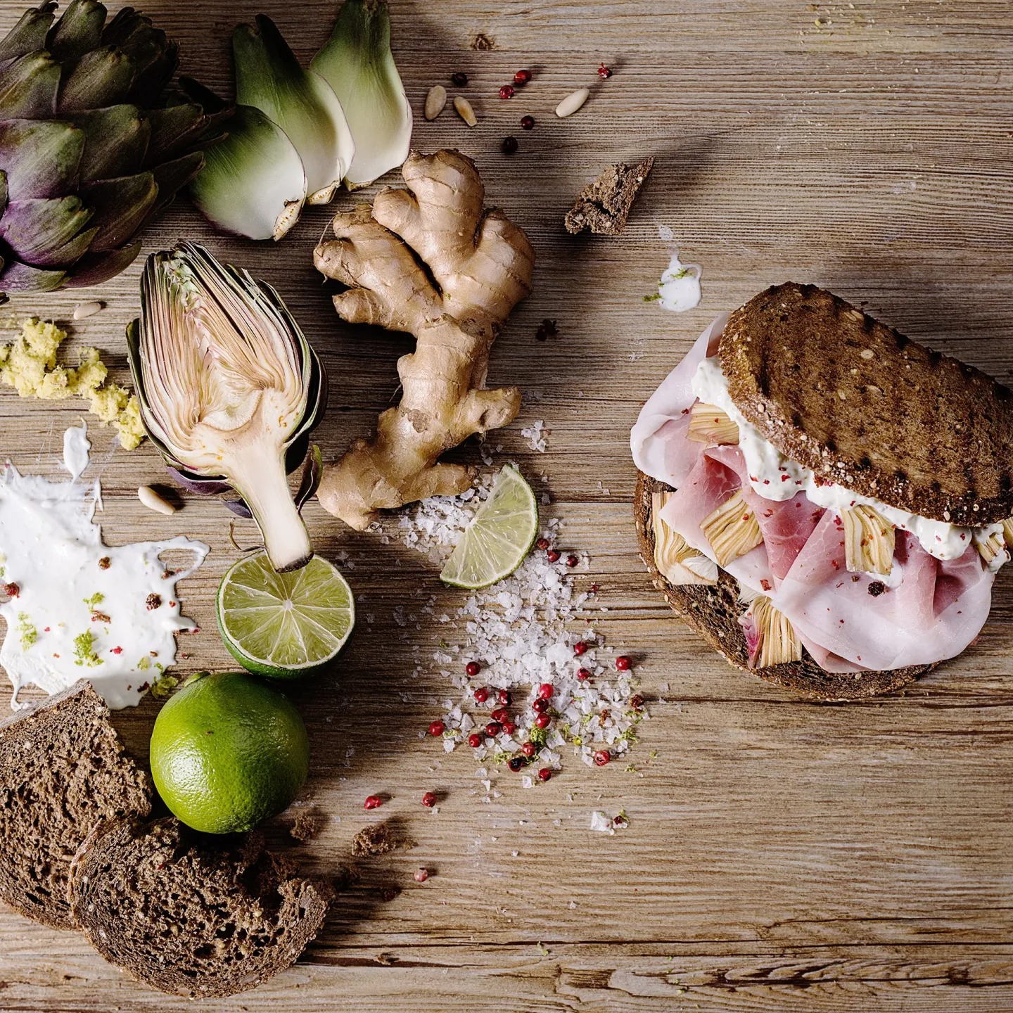 Tra gli abbinamenti meno sfruttati eppure molto gustosi, prosciutto cotto e carciofi insaporiti con una salsa allo yogurt. Per preparare questo panino velocemente potete usare i carciofini sott’olio, ma se preferite usare i carciofi crudi, decisamente più light, li preparerete in pochissimi minuti. Per questo panino consigliamo il pane di segale, che bruschettato, farà la differenza bilanciando le note amare, acidule e dolci di tutti gli ingredienti. Tutta la ricetta con dosi e ingredienti del panino con prosciutto cotto, carciofini e salsa allo yogurt.