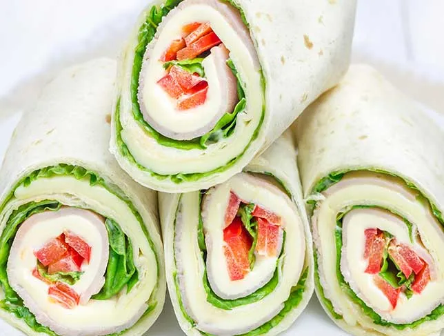 Per prima cosa lavate il pomodoro e tagliatelo in cubetti che va condito con un pizzico di sale e un filo di olio E.V.O. Quindi tagliate la mozzarella in fette sottili. A questo punto fate scaldare una padella e mettete la piadina a scaldare. Basteranno 2 o 3 minuti per scaldare bene il primo lato in modo che non sia più gommoso, girate la piada e fate scaldare anche l'altro lato. Abbassate la fiamma e, lavorando sulla padella, distribuite il formaggio spalmabile in modo che raggiunga i bordi della piadina. Se avete scelto la mozzarella coprite tutta la superficie della piadina. Allo stesso modo distribuite le fette di petto di tacchino. Trasferite tutto su un piatto di portata, sistemate sopra al prosciutto le foglie di lattuga e sopra, ma solo al centro della piadina, i cubetti di pomodoro. A questo punto arrotolate la piadina e tagliatela a metà. Potete lasciar raffreddare la piadina e poi chiuderla nella carta stagnola e conservarla in frigorifero fino al momento di mangiarla.