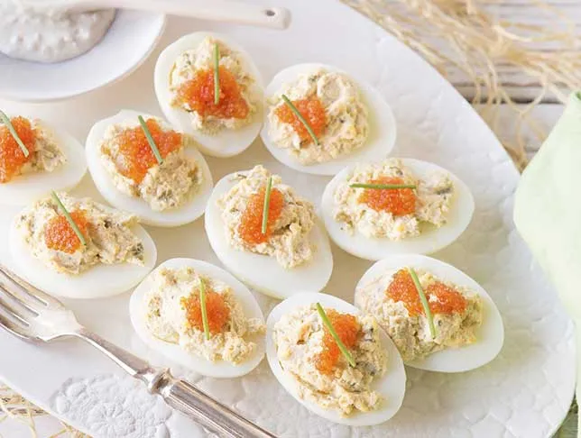 Gli stuzzichini per l’aperitivo più sostanziosi di tutti sono a base di uova sode ripiene. Possono essere preparate in molti modi usando sempre il tuorlo dell’uovo come base. Dopo aver cotto le uova lasciatele raffreddare, quindi sgusciatele e tagliatele a metà per il lungo. Togliete il tuorlo e lavoratelo con della maionese e un pochino di yogurt bianco. Usate questa crema per farcire le uova, magari usando una sacca da pasticciere in modo da rendere le uova ripiene più appetibili. Spolverate con del prezzemolo. Potete farcire le uova creando una salsa con il tuorlo e del tonno o del prosciutto tritato molto fine. Decorate con dei capperi dissalati. Ancora, potete mescolare il tuorlo a del formaggio cremoso al quale aggiungere delle olive nere dolci tagliate in piccoli pezzi.