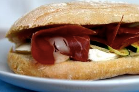 - Nel panino,inserite gli ingredienti in quest’ordine: mozzarella tagliata a fettine sottili e leggermente condita, fettine di mandorla, zucchine grigliate e culatello.