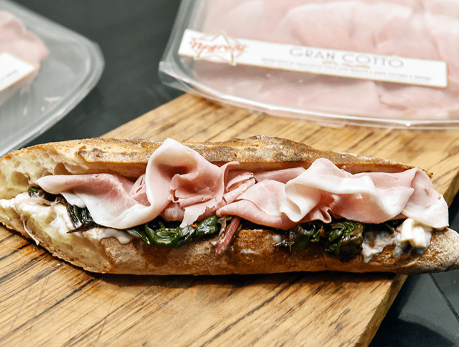 La chiave di lettura di questo panino gourmet è una: il contrasto. La croccatenzza della baguette incontra la morbidezza della stracciatella; il Gran Cotto 100% italiano Negroni è il protagonista assoluto di questo nuovo panino di Max Mariola.