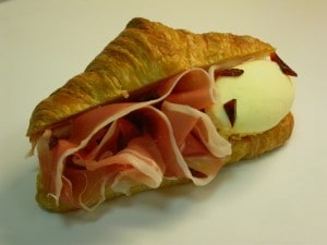 Fare un caramello con l’aggiunta dell’aceto balsamico e spezzettarlo in scaglie. Montare il croissant con tutti gli ingredienti.