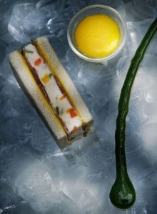 Sandwich di gelato al Parmigiano Reggiano e verdure candite, Prosciutto di Parma, salsa rucola e maionese all’olio di nocciola di Igor Macchia