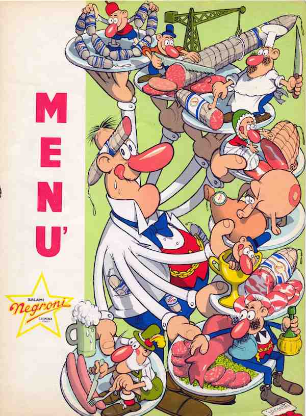 Era il 1950 quando il famoso fumettista Benito Jacovitti, inventore del mitico Cocco Bill protagonista di tanti Carosello, creò un simpatico menu per i salumi Negroni.