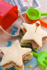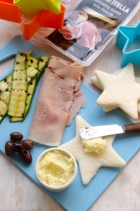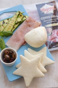 Per prima cosa tagliate le zucchine a fettine non troppo sottili e grigliatele sulla piastra. Nel frattempo fate la vostra crema di mozzarella: tagliate il formaggio a tocchetti, mettete tutto in un piccolo frullatore, aggiungete il cucchiaio di olio e fate andare le lame fino a raggiungere una consistenza cremosa. Tagliate le fette di pane a forma di stellina marina. Iniziate a comporre il vostro panino: spalmate la crema di mozzarella sulla prima stellina di pane, adagiate le zucchine grigliate, le olive taggiasche fatte a pezzetti grossolani e le foglioline di basilico; sistemate poi un altro strato di pane, spalmate con la crema e le fette di prosciutto cotto, chiudete con un’altra stellina e mettete in un sacchettino di plastica.
