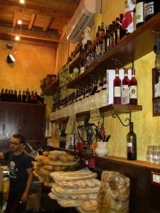 Effige del locale una corpulenta signora che incita ilsuocavallo a trascinarsi dietro un carro di ognibendiddio. Di tutto di più sarà infilato nella vostra mezza frusta, con o senza salsa verde. La seconda opzione vi viene lasciata insieme alla domanda: prosciutto o carne? Dopodiché via libera a fettine sottili di cipolle sott’aceto, pomodorini secchi, carciofi, borlotti, fagiolini verdi lessati, melanzane grigliate.