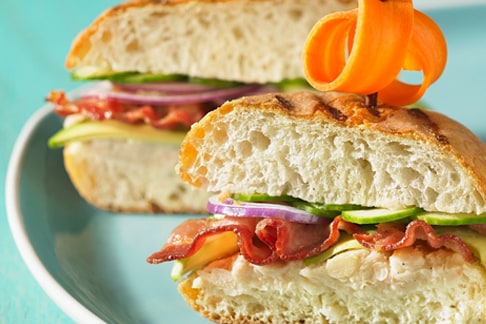 Tagliare il panino in due e usare due stuzzicadenti per non far fuoriuscire gli ingredienti. Infilzare con lo stuzzicadenti le strisce di carote che avete tagliato e aggiungere un’oliva snocciolata in cima.