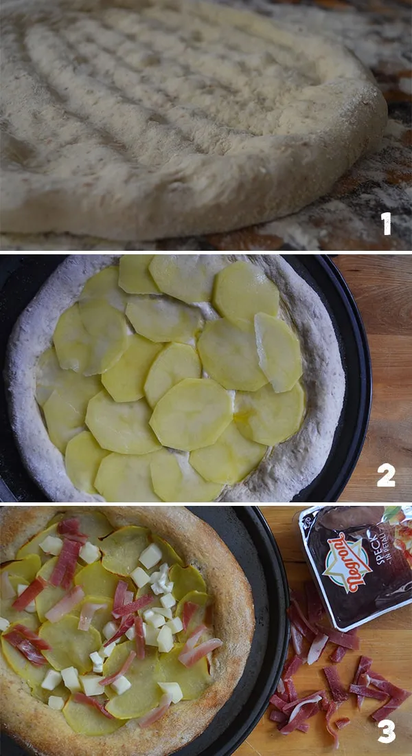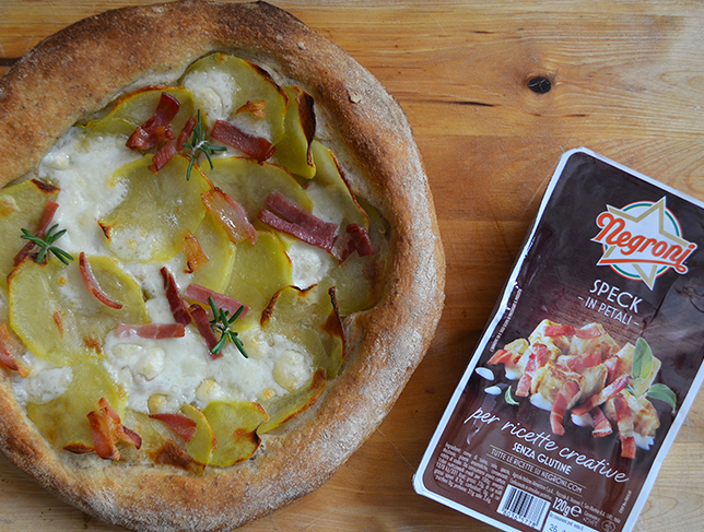 Nell’attesa dedicatevi a preparate gli ingredienti. Tagliate a fettine sottilissime le patate e posatele in un recipiente pieno d'acqua, rilasceranno il loro amido e risulteranno più croccanti in cottura. Tagliate a cubetti la provola e la mozzarella in quantità inferiore, teneteli in un recipiente. Lo Speck in petali Negroni potete metterlo a crudo sulle patate oppure farlo cuocere in una padella antiaderente. Non serve l'olio d'oliva, cuocerà nei suoi grassi, impiegherà circa tre minuti a fiamma media. Trenta minuti prima d'iniziare a stendere i vostri panetti, accendete il forno a 250°: dovrà essere ben riscaldato al momento dell'uso.
