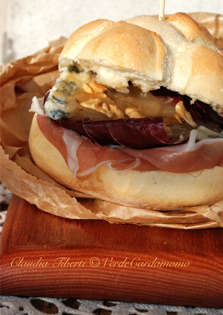 Tostare la rosetta in forno per renderla croccante, tagliarla a metà. Sulla base mettere le fette di prosciutto crudo S. Daniele, poi le foglie di radicchio una fetta di gorgonzola piccante e su questa spalmare la composta di pere al cardamomo. Spezzettare grossolanamente le noci e far cadere qualche goccia di miele al pino. Prendere a morsi.