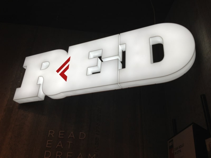 Eravamo curiosi di capire, di vedere da vicino questo nuovo esperimento. La trasformazione di un vecchio negozio di cd e musica (Ricordi Media Store) in qualcosa di nuovo. Un luogo (detto concept store da alcuni) dove poter leggere (READ), perché “il libro resta il centro anche di questi nuovi negozi, il motore primo, il cuore identitario, culturale ed economico dell’impresa”; dove poter mangiare (EAT), perché “il cibo è cultura […] e RED saprà essere uno spazio in cui ci si riprende tempo e socialità, girando senza tra gli scaffali e pranzando, cenando, bevendo un aperitivo o facendo colazione”; dove poter sognare (DREAM) perché “è l’insieme di architettura, design, comunicazione, percorsi, eventi che fanno di RED un luogo in cui si vuole andare e che trasformano in esperienze quelle che altrimenti vivremmo come semplici, quotidiane incombenze”