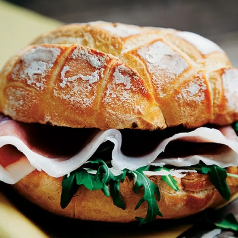 Focaccia con prosciutto crudo, stracchino e pesto di rucola