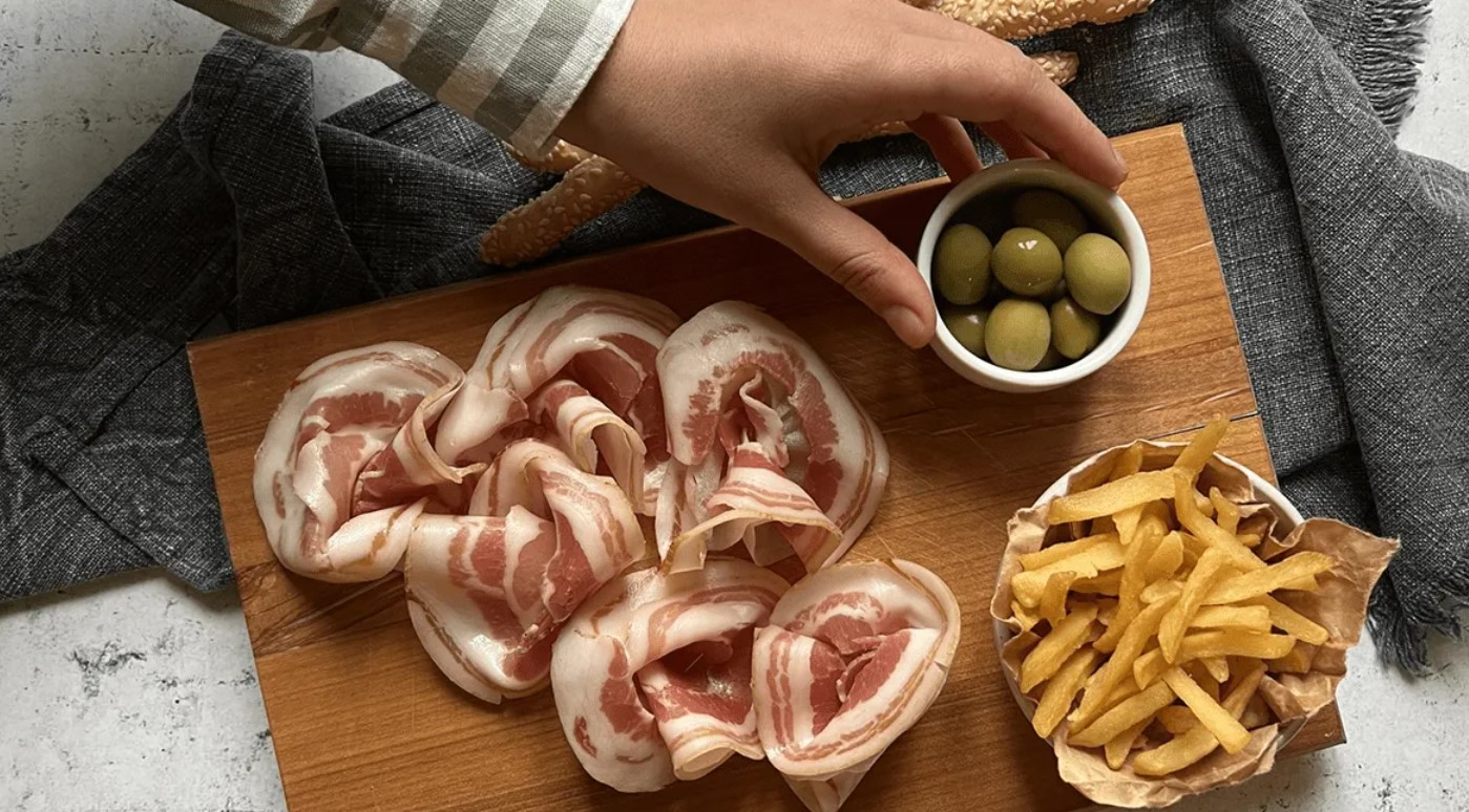 Sul tagliere di legno, disponi fette di Pancetta di Zibello 100% italiana Negroni, olive verdi, grissini e le patatine fritte. Aggiungi un tocco in più servendo la maionese di barbabietola come accompagnamento. La sua consistenza cremosa e il sapore leggermente dolce e terroso si abbina splendidamente con la croccantezza delle patatine e la sapidità della pancetta. Completa il tutto con salse classiche come ketchup e, se lo preferisci, altre salse a piacere. Questo tagliere è perfetto per un aperitivo sul divano davanti alla tua serie preferita, offrendo una combinazione irresistibile di sapori e consistenze.