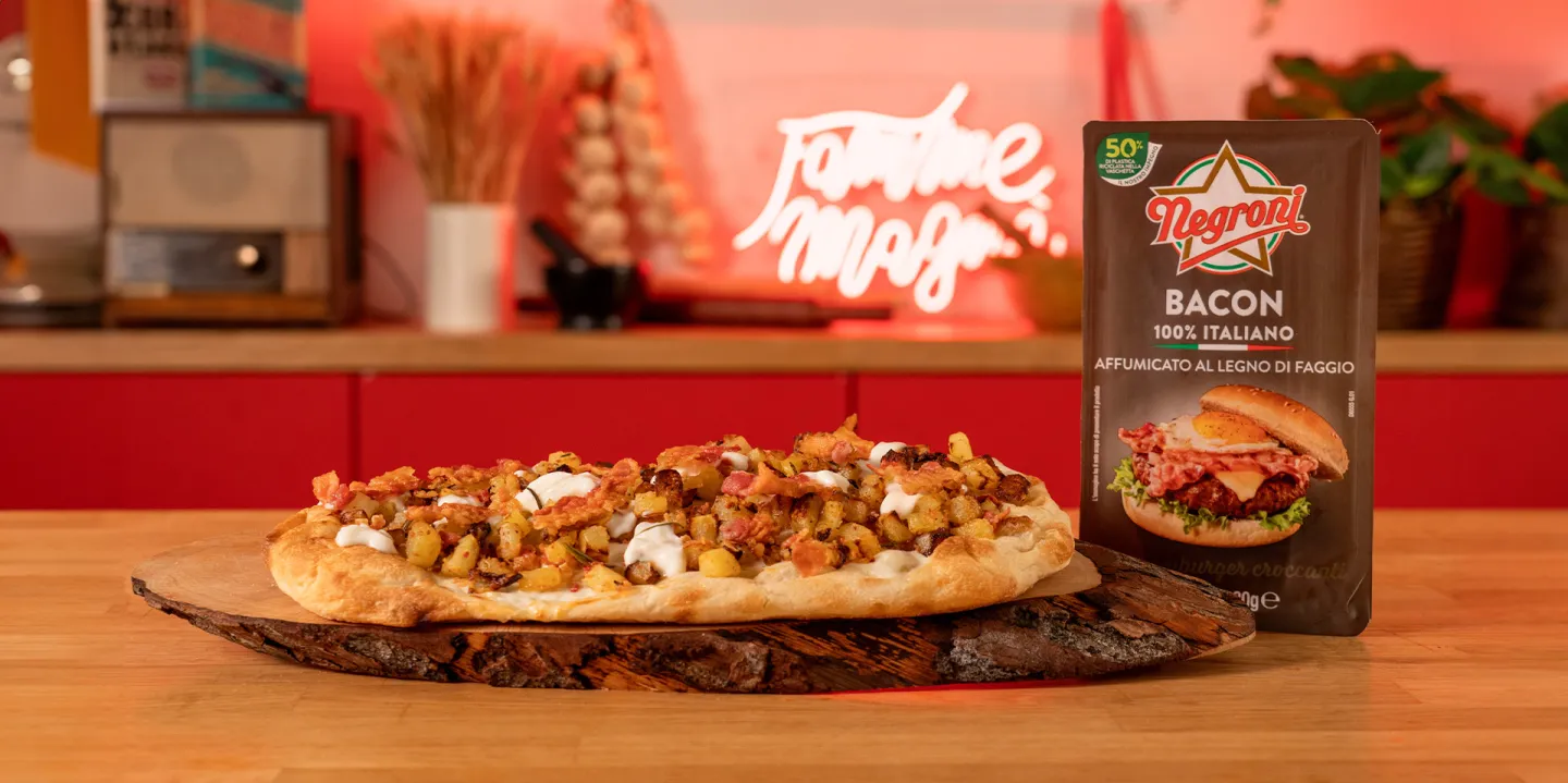 Con il Bacon a fette Negroni 100% Italiano, la ricetta di Ferruccio diventa davvero irresistibile! E, come direbbe lui, con una pinsa così per i suoi avversari “non c’è storia!”.