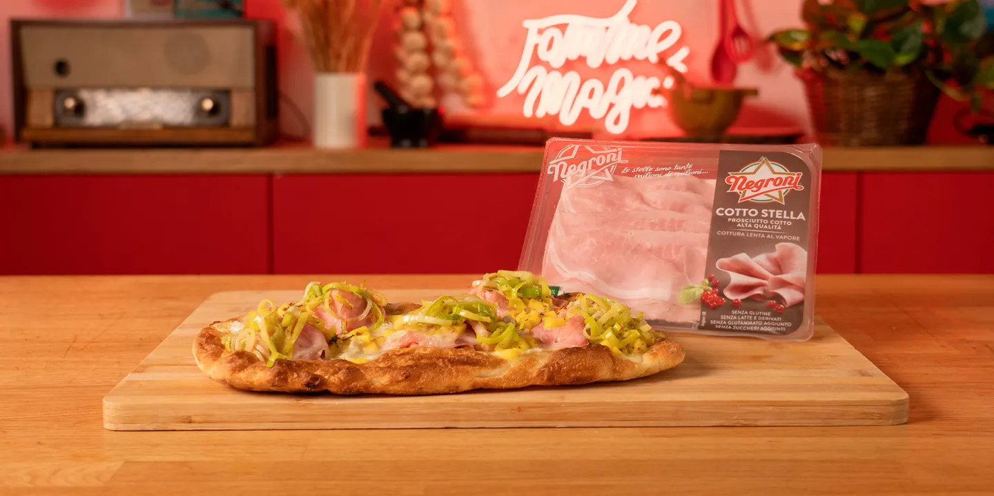 Farcite la pinsa con il Prosciutto Cotto Stella Negroni e i fiocchi di gorgonzola.