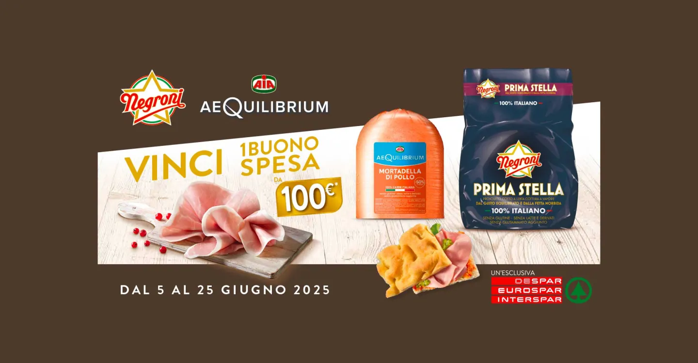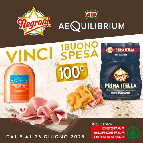 Dal 5 al 25 giugno 2025 acquista in un’unica spesa almeno 200gr. di Prosciutto Cotto Primastella Negroni 100% italiano o di Mortadella di Pollo AIA Aequilibrium, venduti al banco taglio di uno dei punti vendita aderenti.